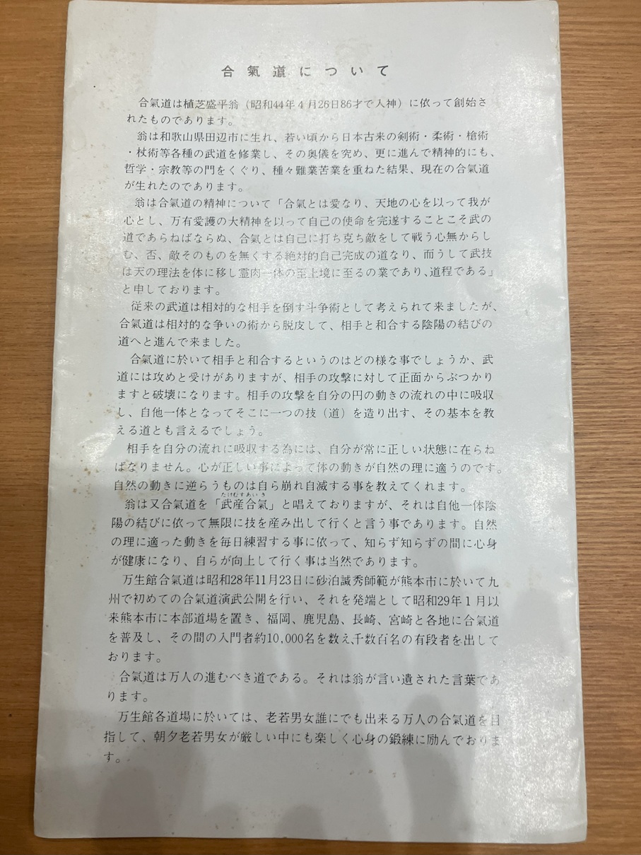 さて、再三橋本先生のお話は書いておりますが、橋本先生は万生館合気道 砂泊諴秀先生の内弟子で